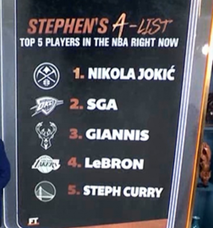 6月26日讯 今天,NBA名嘴A-史密斯在《First Take》节目中排出了自己心目中的NBA现役Top5,分别是: