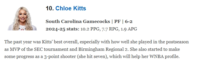 而博伊尔斯的女友不是别人,正是与他同样来自南卡的球员克洛伊-基茨。在此前ESPN的2026年WNBA选秀早期预测中,基茨将在明年第10顺位被选中。