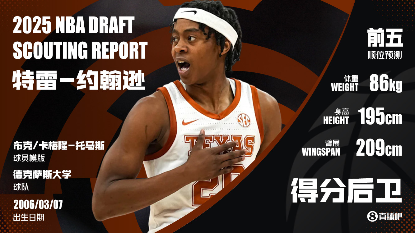 2024-25赛季,特雷-约翰逊为德克萨斯大学出战33场比赛,场均登场34.7分钟可以拿下19.9分3.1篮板2.7助攻0.9抢断0.3盖帽1.8失误,投篮命中率是42.7%,三分命中率为39.7%,罚球命中率是87.1%。