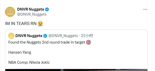 今日杨瀚森首轮第16顺位被开拓者选中,丹佛邮报转发昨日的推特,并写道:“此刻我哭了😭”