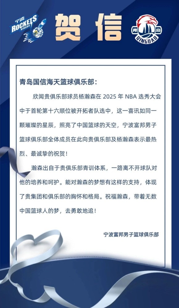 欣闻贵俱乐部球员杨瀚森在2025年NBA选秀大会中于首轮第十六顺位被开拓者队选中,这一喜讯如同一颗璀璨的星辰,照亮了中国篮球的天空,宁波富邦男子篮球俱乐部全体成员在此向贵俱乐部及杨瀚森表示最热烈、最诚挚的祝贺!