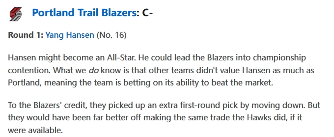 ESPN专栏作家、数据专家Kevin Pelton撰文评价了杨瀚森,他写道:“瀚森有望成为全明星球员,并带领开拓者队争夺冠军。我们知道的是,其他球队并没有像波特兰那样重视瀚森,这意味着开拓者队押注于自己的眼光能够超越市场。