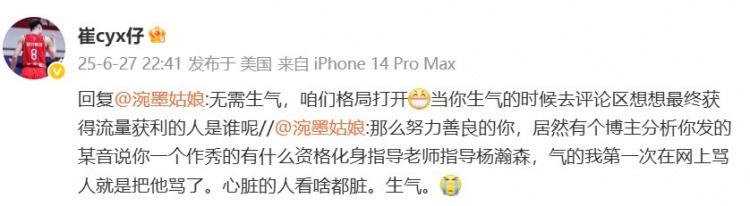 崔永熙随后回复道:“无需生气,咱们格局打开😁当你生气的时候去评论区想想最终获得流量获利的人是谁呢。”