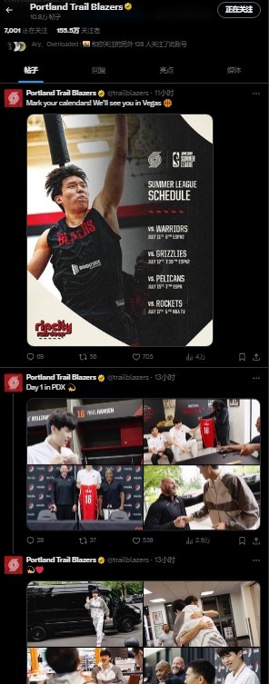 据统计,开拓者官推最近的18条推文全是杨瀚森相关。