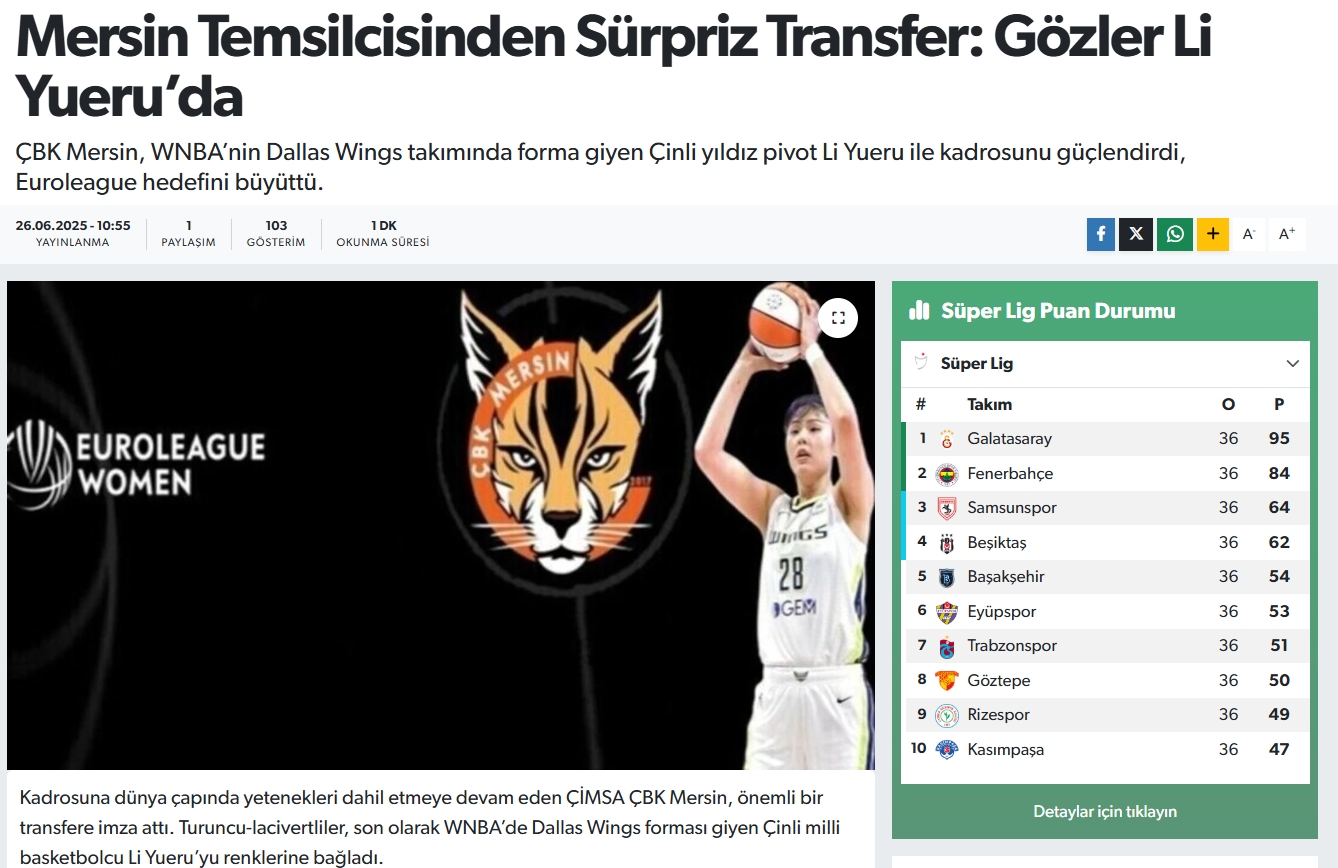 06月29日讯 据《丘库罗瓦报》等多家土媒报道,梅尔辛女篮已经引入中国女篮国手李月汝。此前两个赛季,李月汝曾在贝西克塔斯、博德鲁姆以及加拉塔萨雷三支土耳其联赛球队效力。