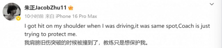 对此,朱正今天更博解释道:“我肩膀旧伤突破的时候被撞到了,教练只是想保护我。”