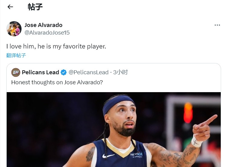 事情是这样的,鹈鹕自媒体@Pelicans Lead 今天发问:“你对阿尔瓦拉多真实的想法是什么?”阿尔瓦拉多转发了@Pelicans Lead 的这条动态,并在旁边写道:“我爱他,他是我最喜欢的球员。”