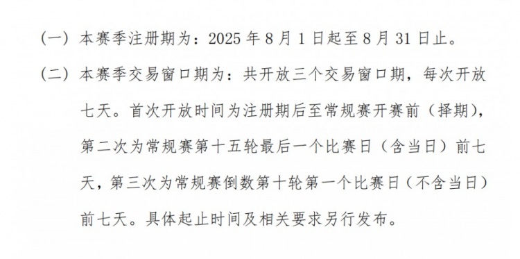根据文件中的规定,新赛季注册期为8月1日到8月31日,另外有三个交易窗口期。