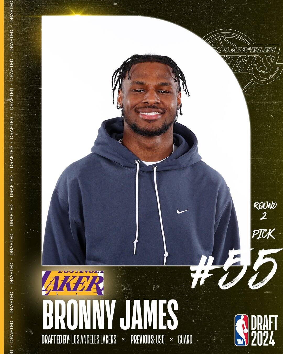 NBA选秀大会,19岁的南加州大学后卫布朗尼-詹姆斯被湖人在第55顺位选中,布朗尼与詹姆斯实现父子同队。