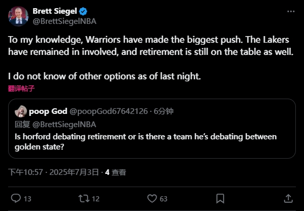 07月03日讯 今日有网友在推特上对ClutchPoints名记Brett Siegel提问:“霍福德是在考虑退役,还是在权衡是否加盟金州勇士?”