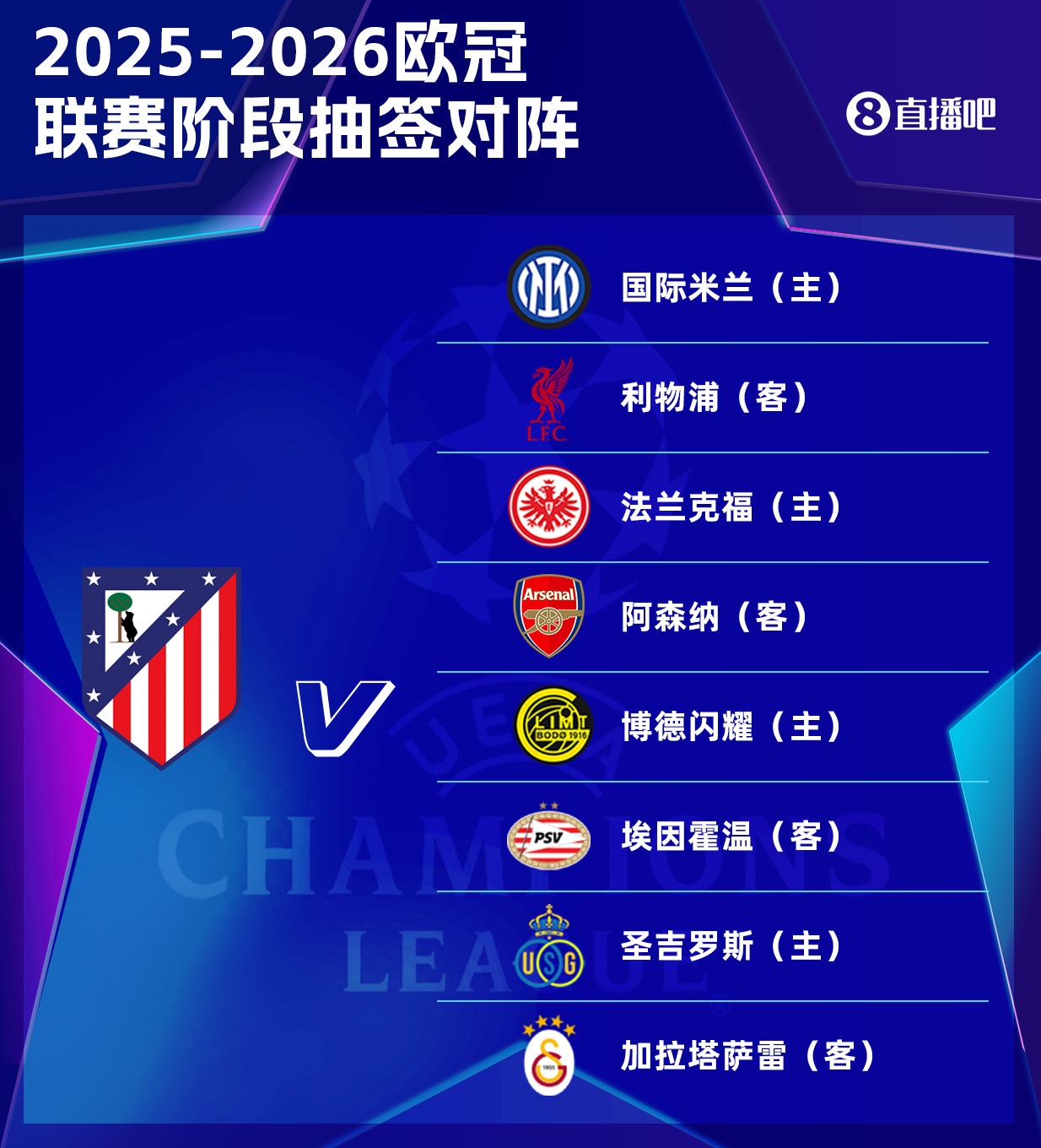 马竞欧冠赛程:开局客战红军第3轮客战枪手,第5轮主场对国米