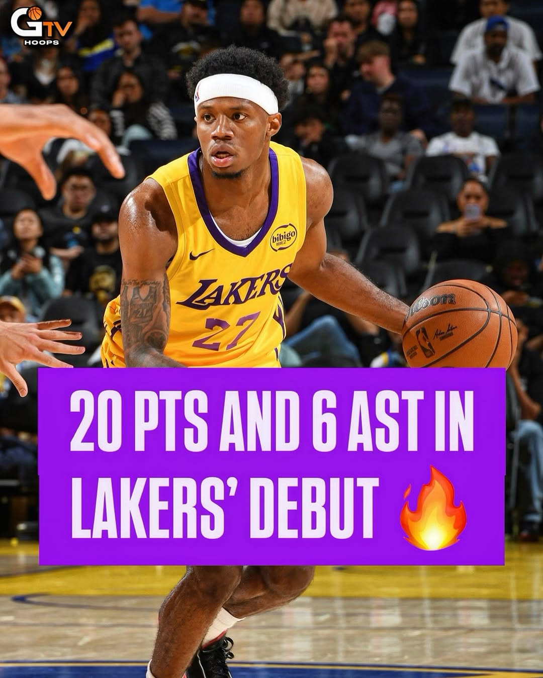 此役,湖人球员DJ-斯图尔特上演湖人首秀,全场比赛出战27分钟,10投7中、三分球1中1,5罚全中得到20分2板6助1断的数据。