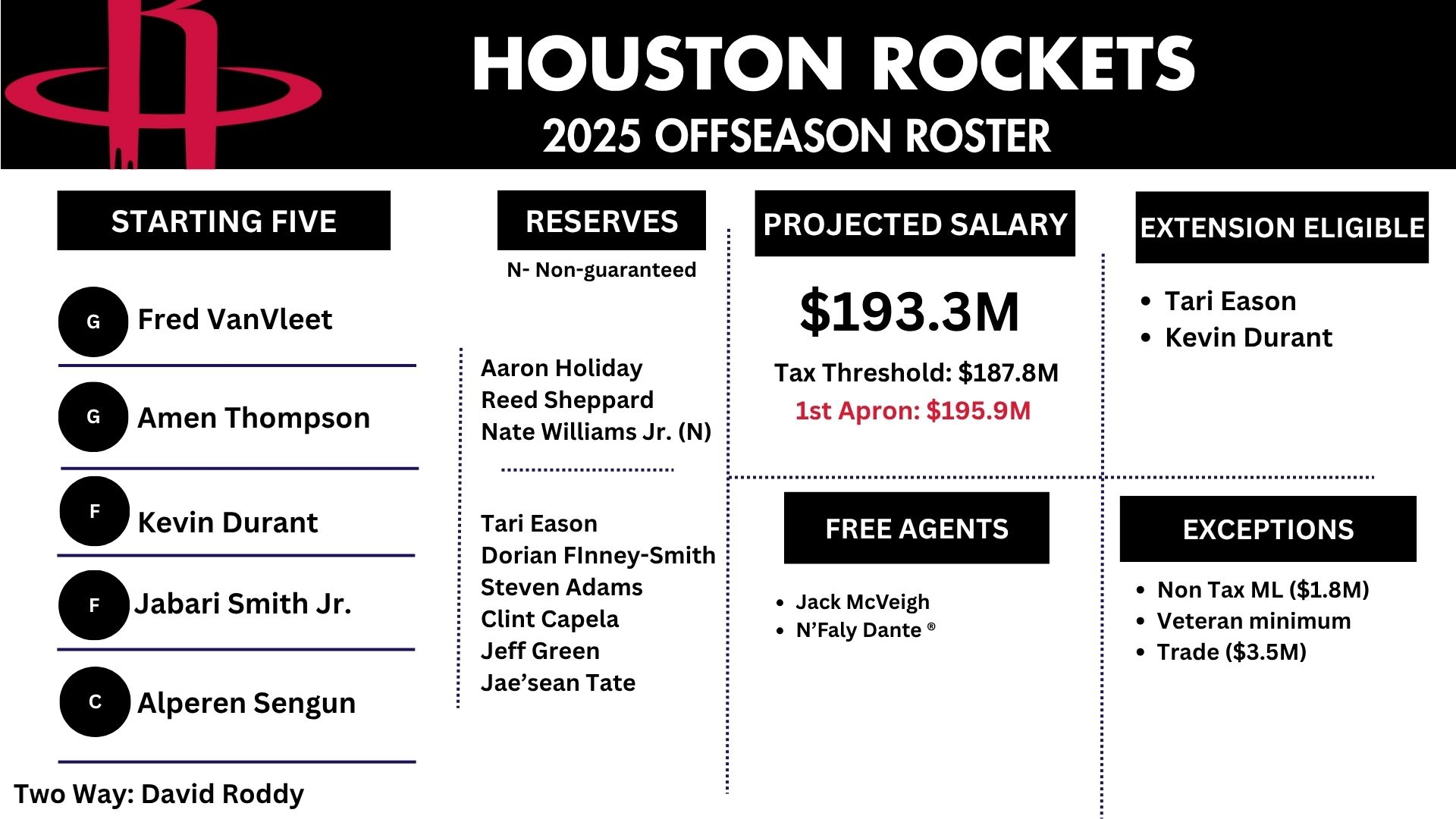 薪资专家Bobby Marks透露,目前火箭名单上有14人(另有一个双向合同的罗迪),总薪资1.933亿美元。