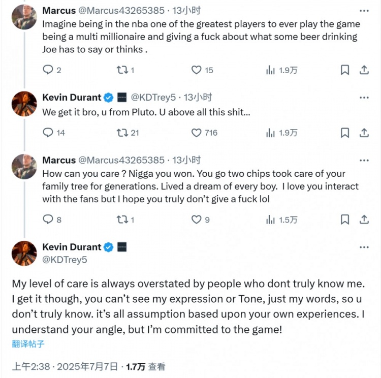 杜兰特:“那些并不真正了解我的人总是会高估我的在意程度。不过我明白,你看不到我的表情和语气,只能看到我的文字,所以你并不真正了解。这一切都只是基于你自身经历的假设。我理解你的立场,但我已投身于这场博弈之中!”