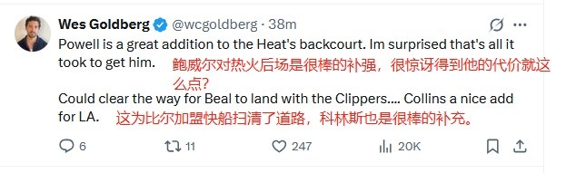 据ESPN名记Shams Charania报道,快船、爵士、热火三方进行重磅交易:约翰-科林斯转投快船、诺曼-鲍威尔加盟热火、凯文-乐福&李凯尔及2027年快船的次轮签被送往爵士。美网友对此展开热议,部分热评如下: