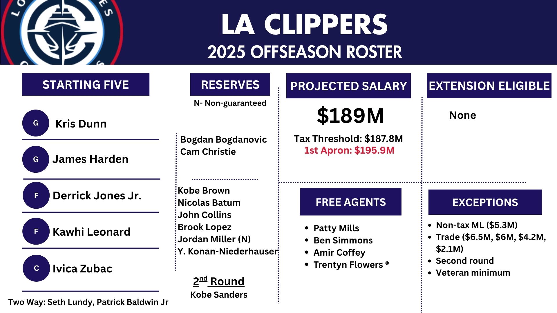 快船已经触发第一硬帽,所以总薪资不能超过1.959亿美元,目前球队总薪资1.89亿美元。