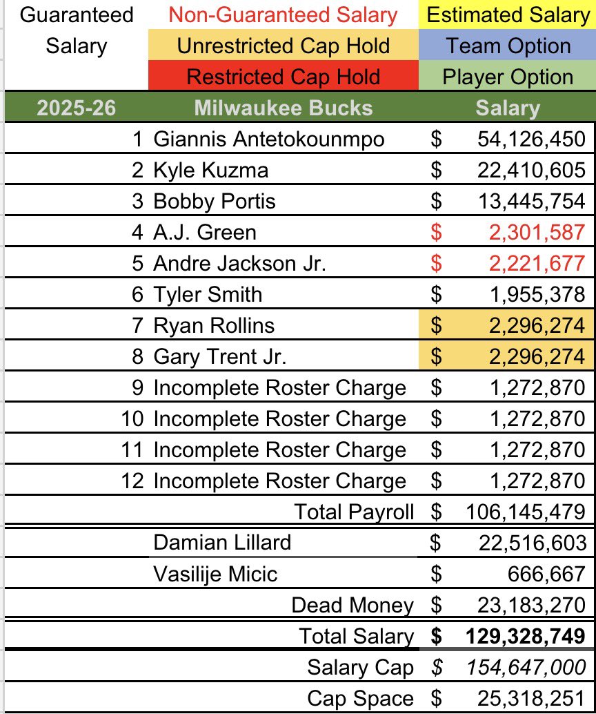 在续约波蒂斯、延伸条款裁利拉德和米西奇后,雄鹿刚好剩下2531.8万美元的空间,全都给了特纳。