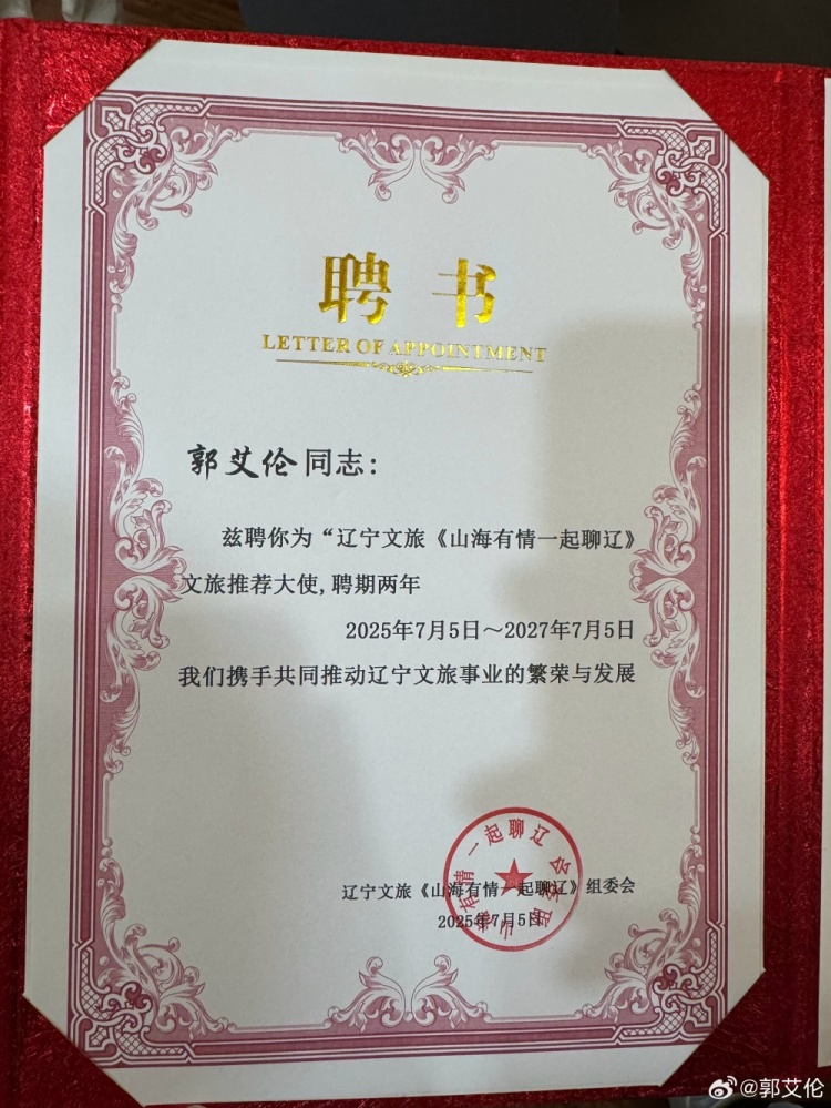 郭艾伦晒出聘书,并发博写道:“感谢我的家乡,欢迎大家来辽宁,我带你们感受风光🤗🤗”