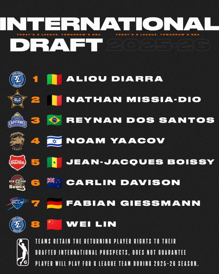 💥NBA G联盟国际球员选秀:林葳第8顺位被独行侠下属球队选中!
