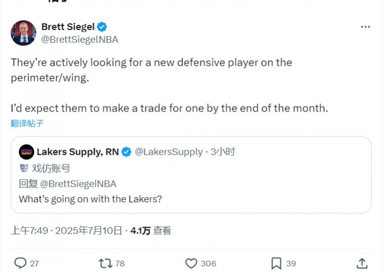 谈到湖人的动向时,Siegel表示:“他们正在积极寻找一个外线/侧翼防守者,我预计他们会在本月结束前交易来一个。”