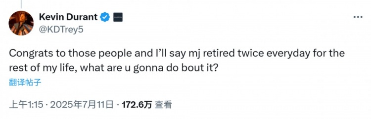 杜兰特回复:“祝贺那些人,在我的余生中,我会每天都说MJ退役了两次,你能拿我怎么样?”