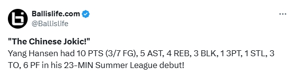 美媒盛赞杨瀚森:“中国约基奇”!首秀23分钟拿下10分5助4板3帽