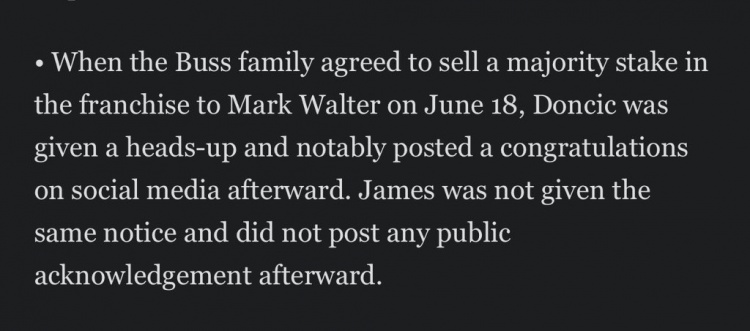 原文原本写道:“当巴斯家族在6月18日同意将湖人的主要股权出售给马克-沃特斯时,东契奇得到了提前通知,并在社媒上发表了祝贺。詹姆斯没有得到同样的通知,在事后也没有就此发表任何公开评论。”