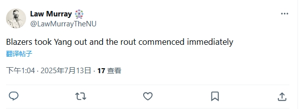快船记者Law Murray表示,开拓者一换下杨瀚森,球队就开始崩盘了。