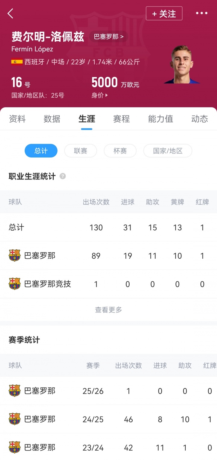 22岁的费尔明出自巴萨青训,截至目前共为巴萨一线队出场89次,打入19球11助攻,他的德转身价为5000万欧元。