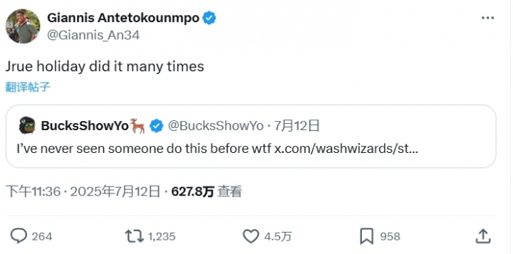 字母哥转发并写道:“霍勒迪经常这么干。”