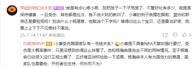 对此,有网友用崔永熙的情况举例,希望篮协不要过度使用杨瀚森,否则可能导致受伤。