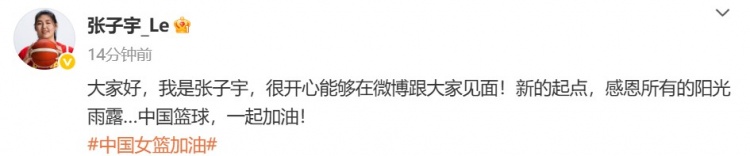 赛后,张子宇更新社媒写道:“大家好,我是张子宇,很开心能够在微博跟大家见面!新的起点,感恩所有的阳光雨露…中国篮球,一起加油!”