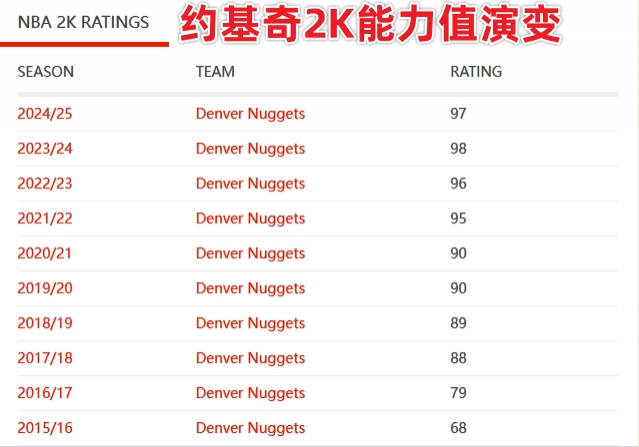 值得一提的是,作为杨瀚森的偶像,约基奇在2015-16赛季的能力值仅为68,随后逐年递增成为能力值第一人。