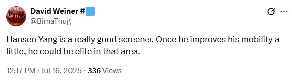 美记David Weiner发推点评杨瀚森表现:“杨瀚森是一位非常出色的掩护球员。只要他的机动性再提高一点,他就能成为这方面的精英级球员。”