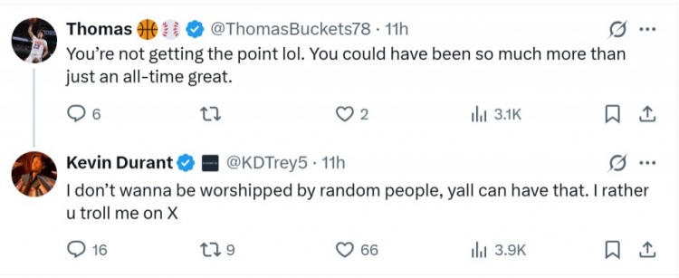 杜兰特:我不希望被一些不认识的人崇拜,你们可以拥有那种感觉。我宁愿你们在X上黑我。