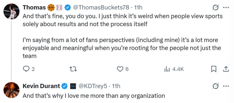 网友称球迷支持球员更有意义!KD:所以我更爱自己而非任何球队