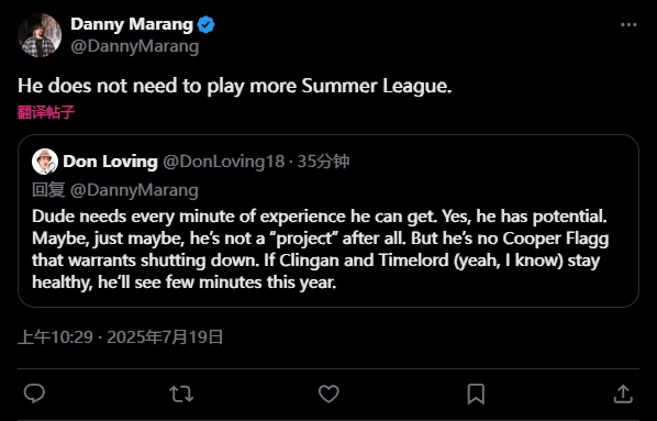 开拓者记者Danny Marang维护杨瀚森,表示:“他不需要夏季联赛的经验了。