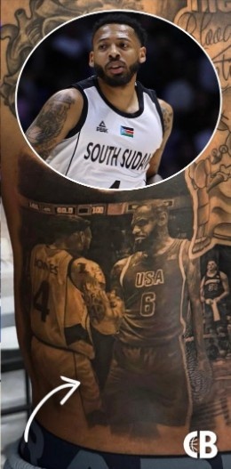 7月22日讯 据美媒Courtside Buzz报道,南苏丹后卫卡里克-琼斯把奥运会上同詹姆斯交手时的合影纹在了后背上。