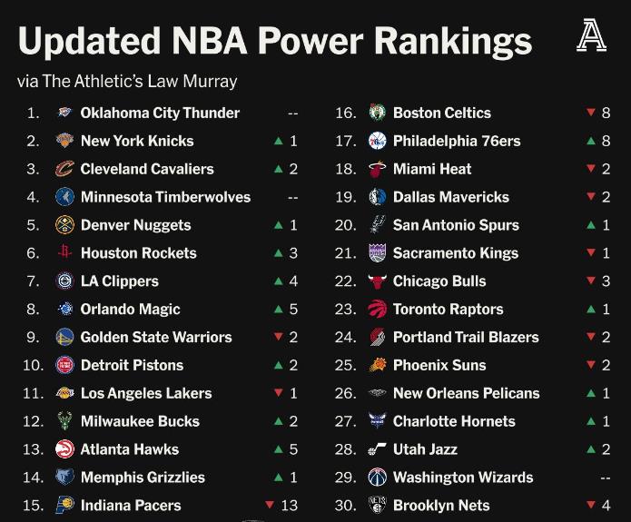 🔥TA实力榜:雷霆榜首 掘5火6船7🚀勇士9&湖人11 开拓者24
