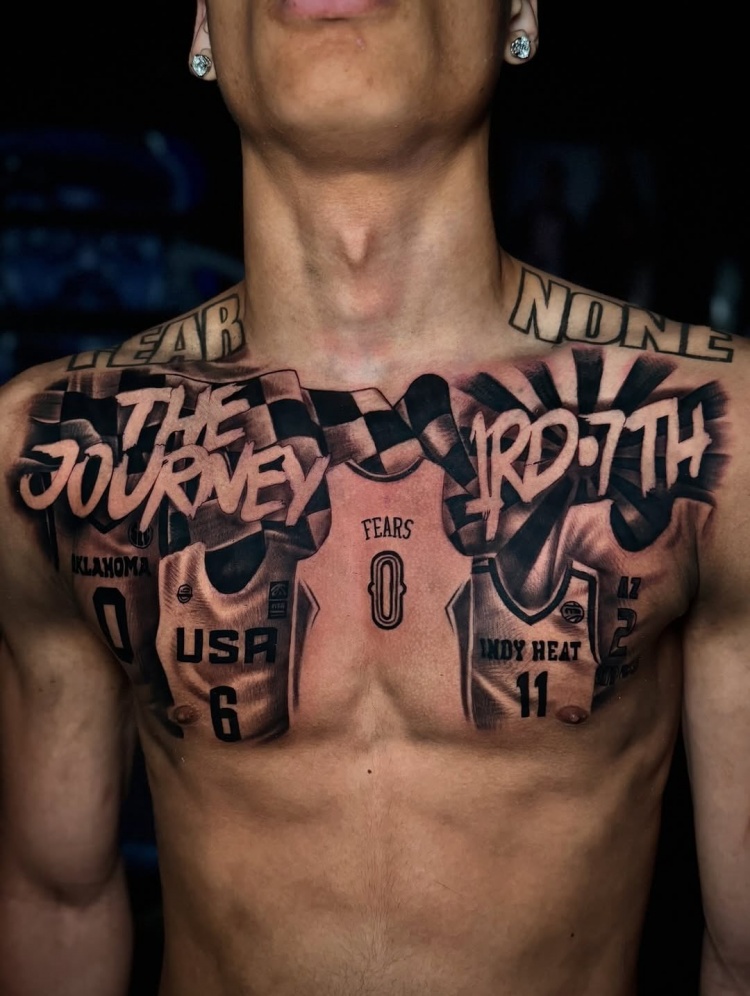 他刚刚为费尔斯在胸前加上了一个纹身作品,图案是费尔斯生涯的那些球衣,其中包括高中、AAU、美国U系列国家队、俄克拉荷马大学还有鹈鹕的球衣。