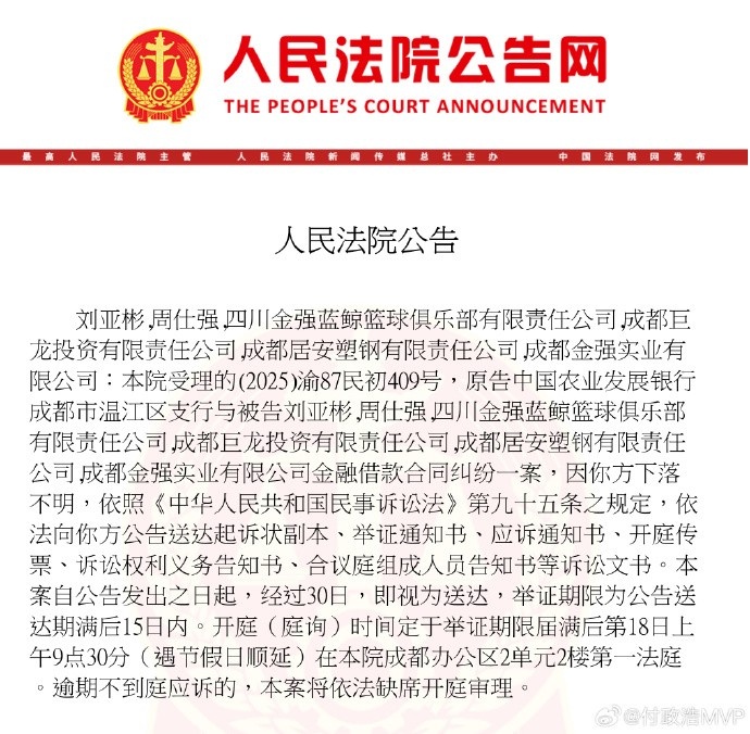 房地产转型之路异常艰难。四川男篮原大股东四川金强实业公司和原球队注册主体四川金强蓝鲸篮球俱乐部近两年来被债主各种起诉,然后被各种强制执行,被追索的金额之大令人咂舌。从去年起,金强老板、四川省篮协掌门周仕强周总的艰难处境在业内就开始流传(前段时间有网友还在我评论区提及周总的情况),着实令人叹息,而法院公告每次的说法则是下落不明。