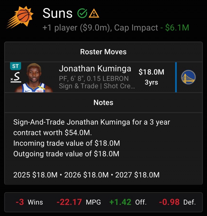 👀勇士太阳交易模拟:勇士送出库明加 得到奥尼尔+理查兹+次轮