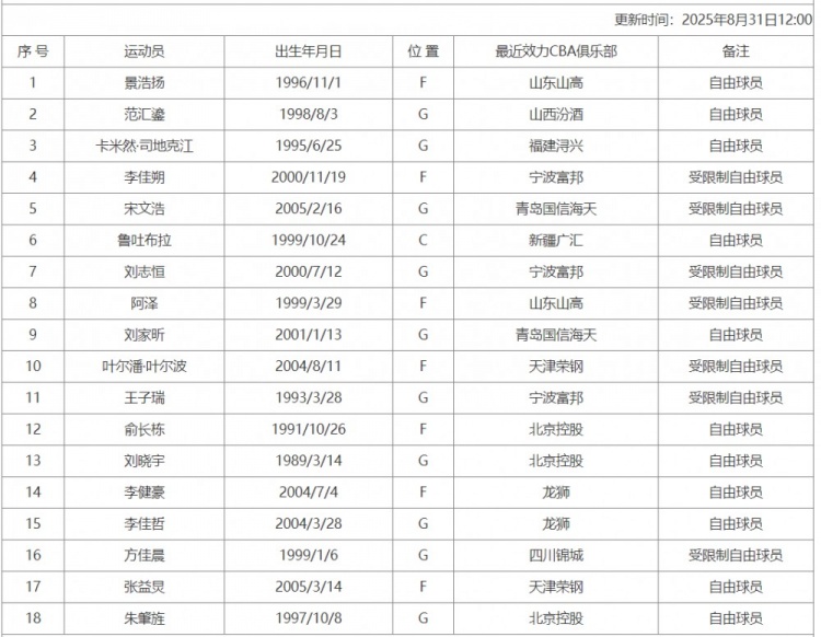 8月31日讯 CBA官网今天更新了联赛自由球员名单,新增范汇鎏等人。