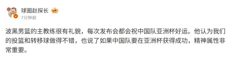 据媒体人@球圈赵探长报道,波黑男篮的主教练很有礼貌,每次发布会都会祝中国队亚洲杯好运。他认为我们的投篮和转移球做得不错,也说了如果中国队要在亚洲杯获得成功,精神属性非常重要。