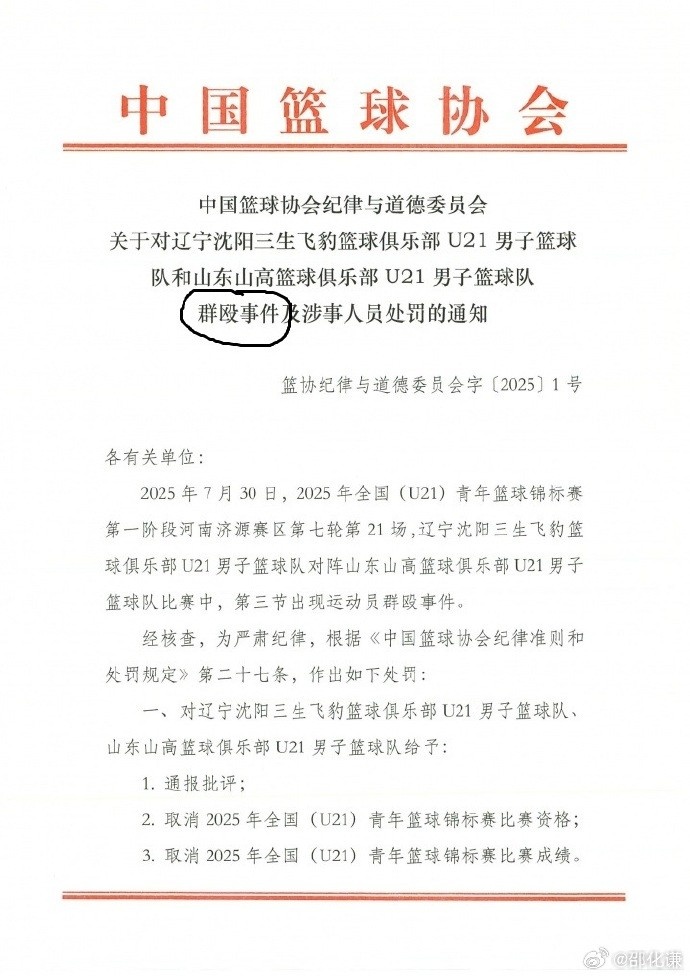 8月1日讯 今天,《体坛周报》记者邵化谦在社媒上点评了中国篮协纪律与道德委员会对日前U21男篮辽宁与山东的群殴事件开出的重磅罚单。