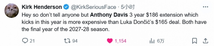 作为史上最令人惊讶的交易的主角之一,浓眉自然被记者们拿来比较——独行侠记者Kirk Henderson表示:浓眉与独行侠的合同还剩3年1.86亿美元,比东契奇还多拿个2100万……