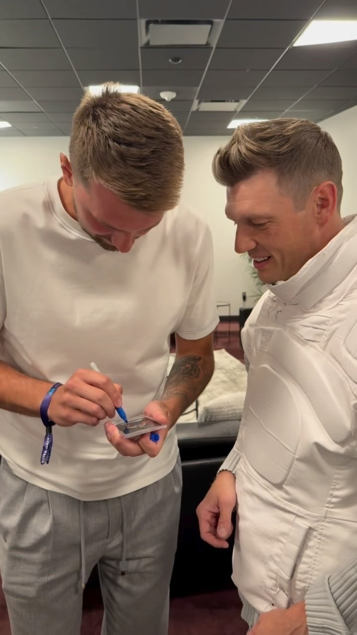 后街男孩(图中为Nick Carter)获赠东契奇的签名球衣,并合影留念。