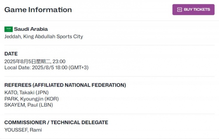 本场比赛的裁判组已经出炉,吹罚本场比赛的三名裁判分别是加藤誉树(日本)、朴景镇(韩国)、保罗-斯卡耶姆(黎巴嫩)。