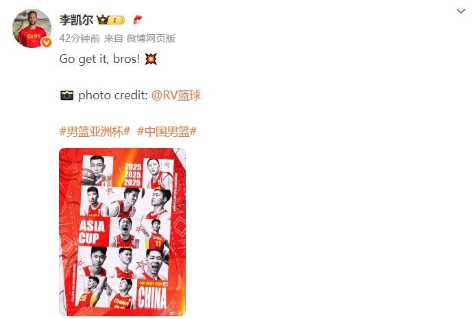 李凯尔晒亚洲杯中国男篮海报:赢下胜利吧 兄弟们!💥