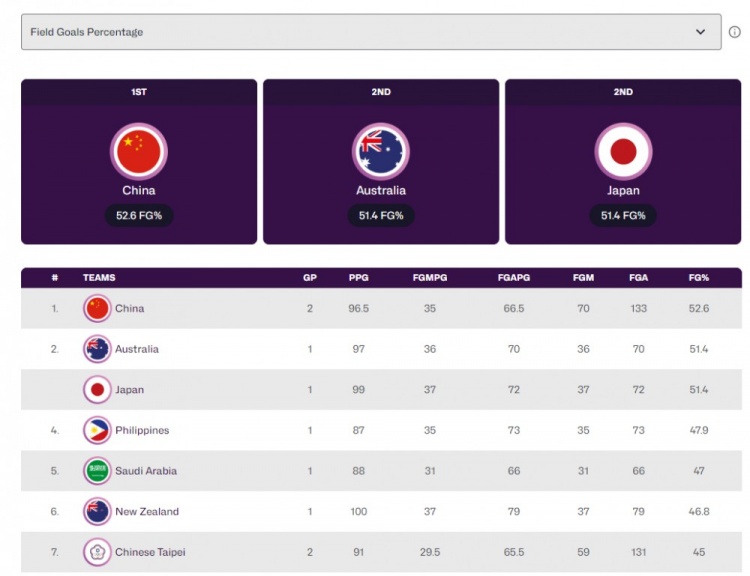 据亚洲杯官网统计,中国男篮2场过后的投篮命中率高达52.6%,暂列第1位!澳大利亚和日本同为51.4%,并列第二。